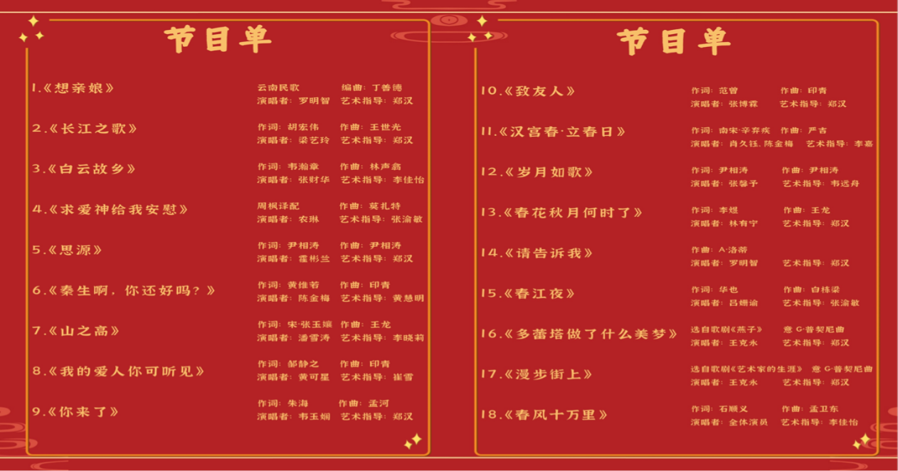 整场音乐会由18首歌曲组合而成,随着罗明智演唱的云南民歌《想亲娘》,本场音乐会正式拉开序幕。紧接着,梁艺玲等员工为观众奉上《长江之歌》《白云故乡》《求爱神给我安慰》《思源》四首动人心弦的歌曲;在这之后,陈金梅动情演绎了民族歌剧《运河谣》选段《秦生啊,你还好吗?》,在场的观众被深深地触动,引起了观众的强烈共鸣;而后潘雪涛等员工给观众带来了《山之高》《我的爱人你可听见》《你来了》《致友人》《汉宫春•立春日》《岁月如歌》《春花秋月何时了》《请告诉我》《春江夜》一系列精彩绝伦的演唱;在音乐会接近尾声时,王克永博士亲自上台为大家演绎了《多蕾塔做了什么美梦》和《漫步街上》两首歌剧咏叹调,把本场音乐会推向了高潮;最后,全体演员共同为大家带来了创作歌曲《春风十万里》,为本场音乐会划上了园满的句号。