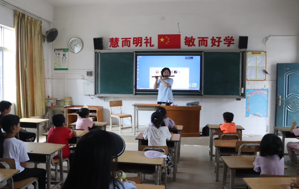 图为实践队队员陈冠竹向小朋友们演奏竹笛